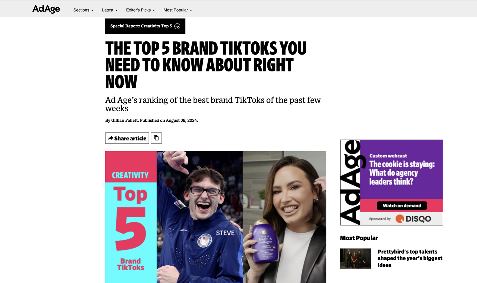 ↘ Ad Age #1 brand to know about on TikTok - August 2024 ↘ Shorty Awards Finalist